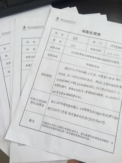2015年8月22日,為紀念反法西斯戰爭勝利70周年,宏業(yè)公司組織全體員工進(jìn)行了一次革命傳統教育活動(dòng),觀(guān)看了電影《鐵道游擊隊》,一同回顧了那段血淚鑄成的抗戰史,共同緬懷先烈們的英靈。