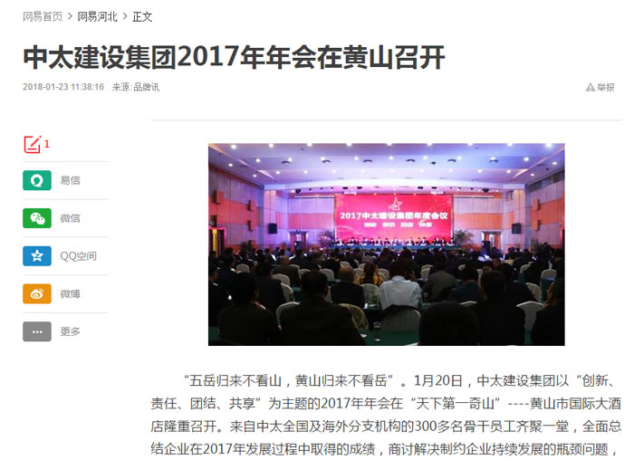 網(wǎng)易報道了“中太建設集團2017年年會(huì )在黃山召開(kāi)”