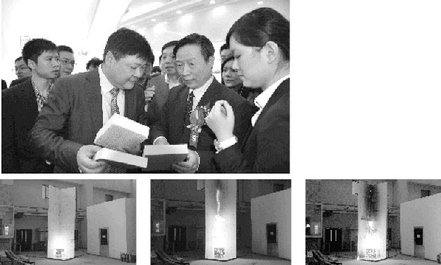 上圖:上海雅達特種涂料有限公司董事長(cháng)顧衛星(前左)在京向住建部領(lǐng)導和專(zhuān)家介紹創(chuàng )新產(chǎn)品聚合聚苯板的性能和特點(diǎn)